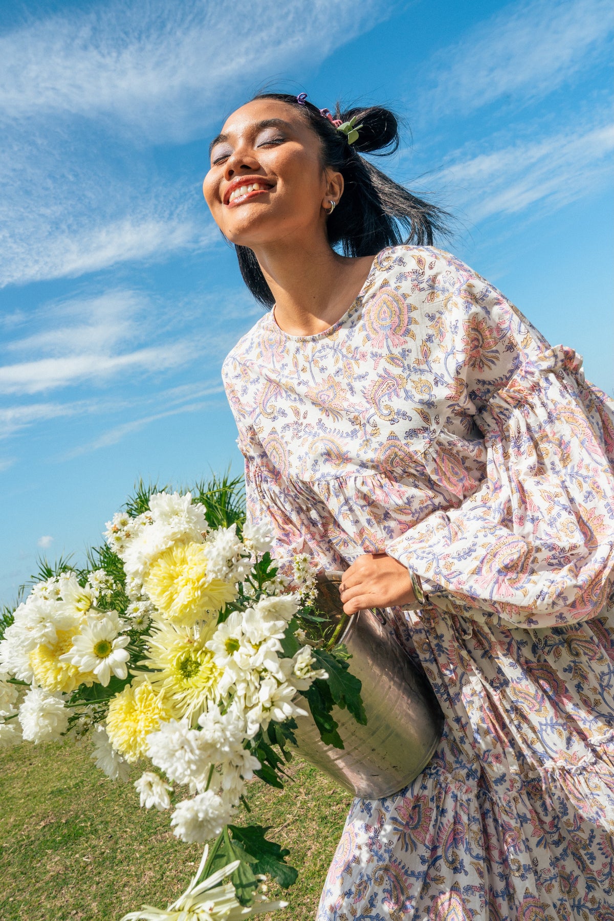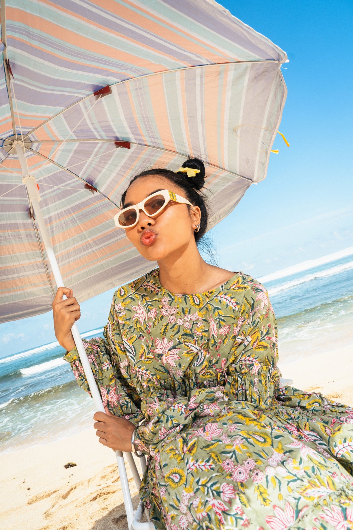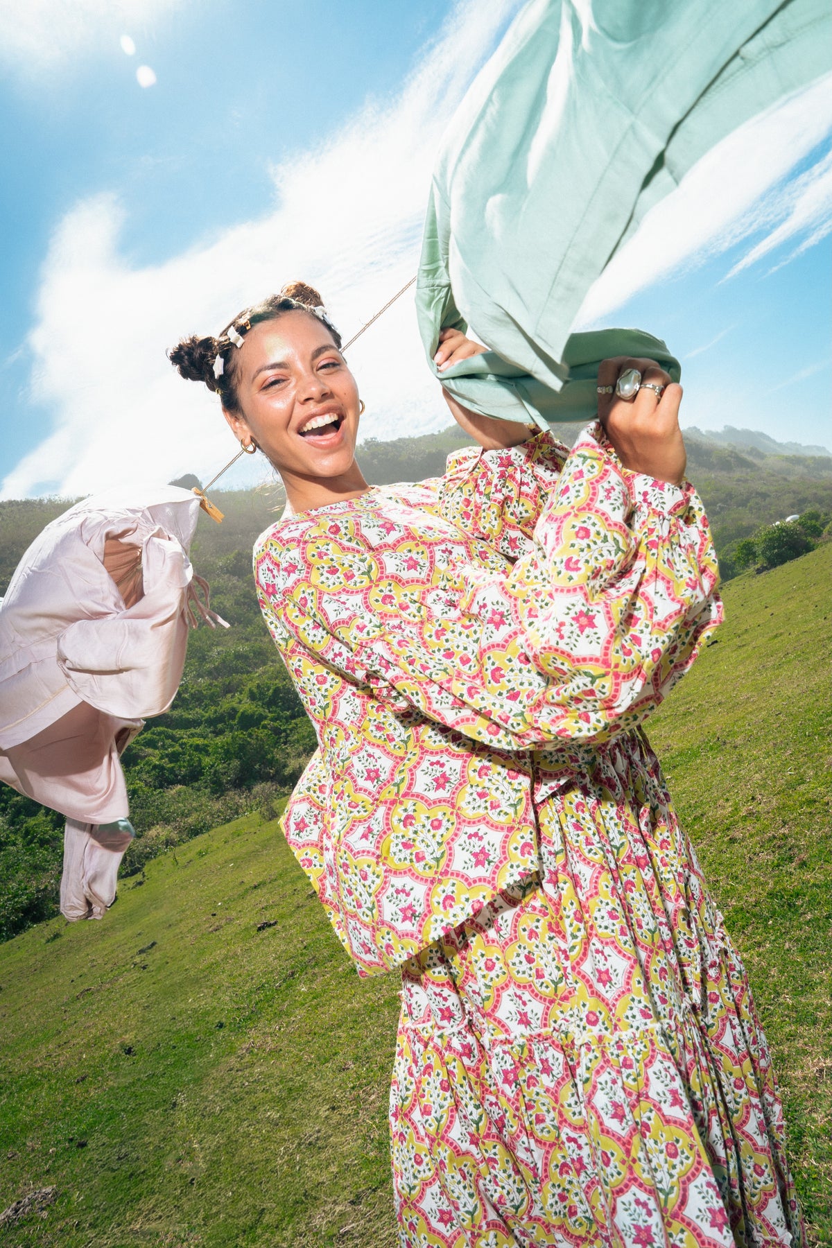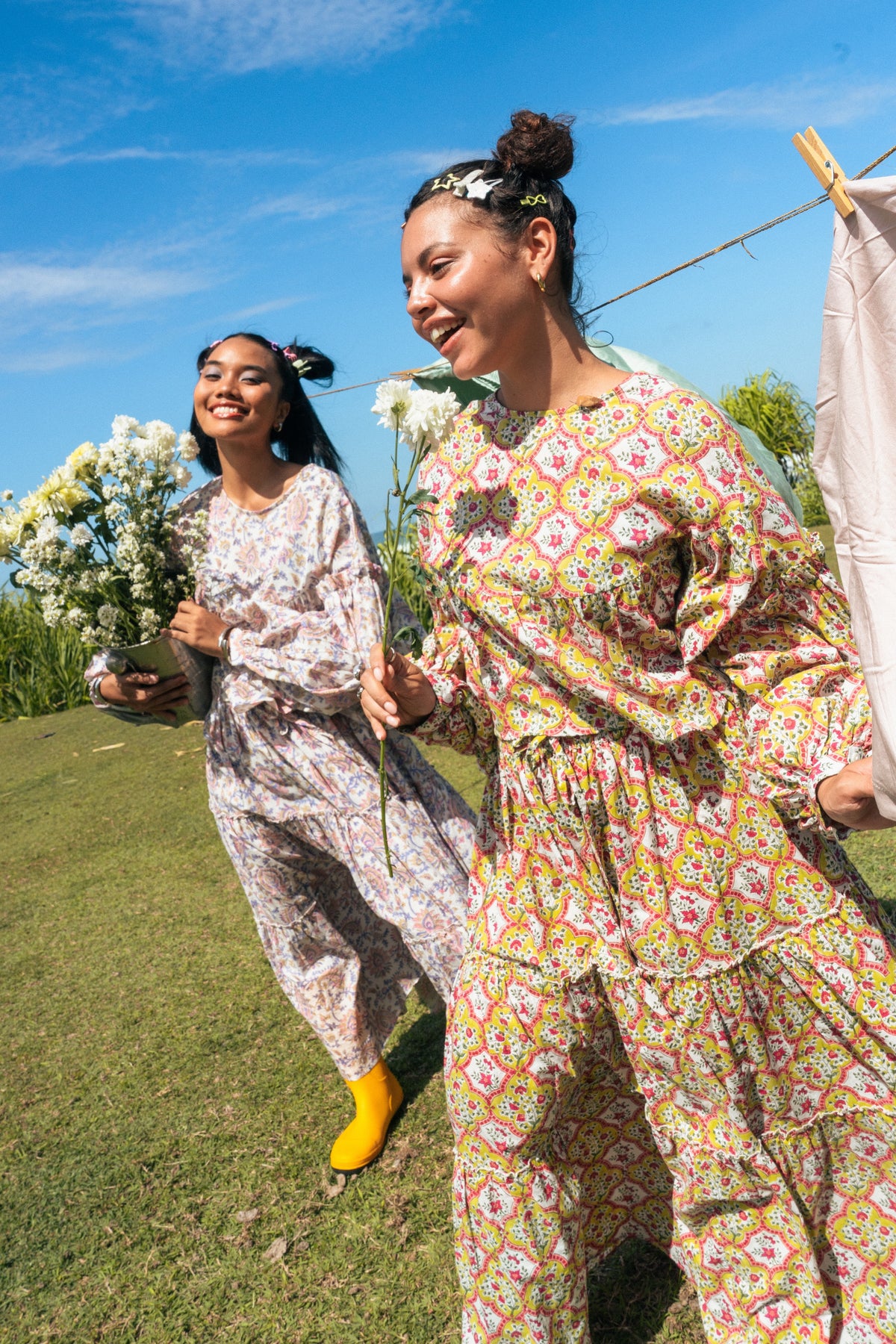 Made from Indian cotton, she is a lightweight, breathable, and naturally soft fabric known for its comfort in warm weather. It’s woven from pure cotton threads then hand-printed or hand-blocked, giving every piece a natural texture and artisanal feel. It drapes gently, feels cool on the skin, and gets softer with every wash making it perfect for everyday wear <3